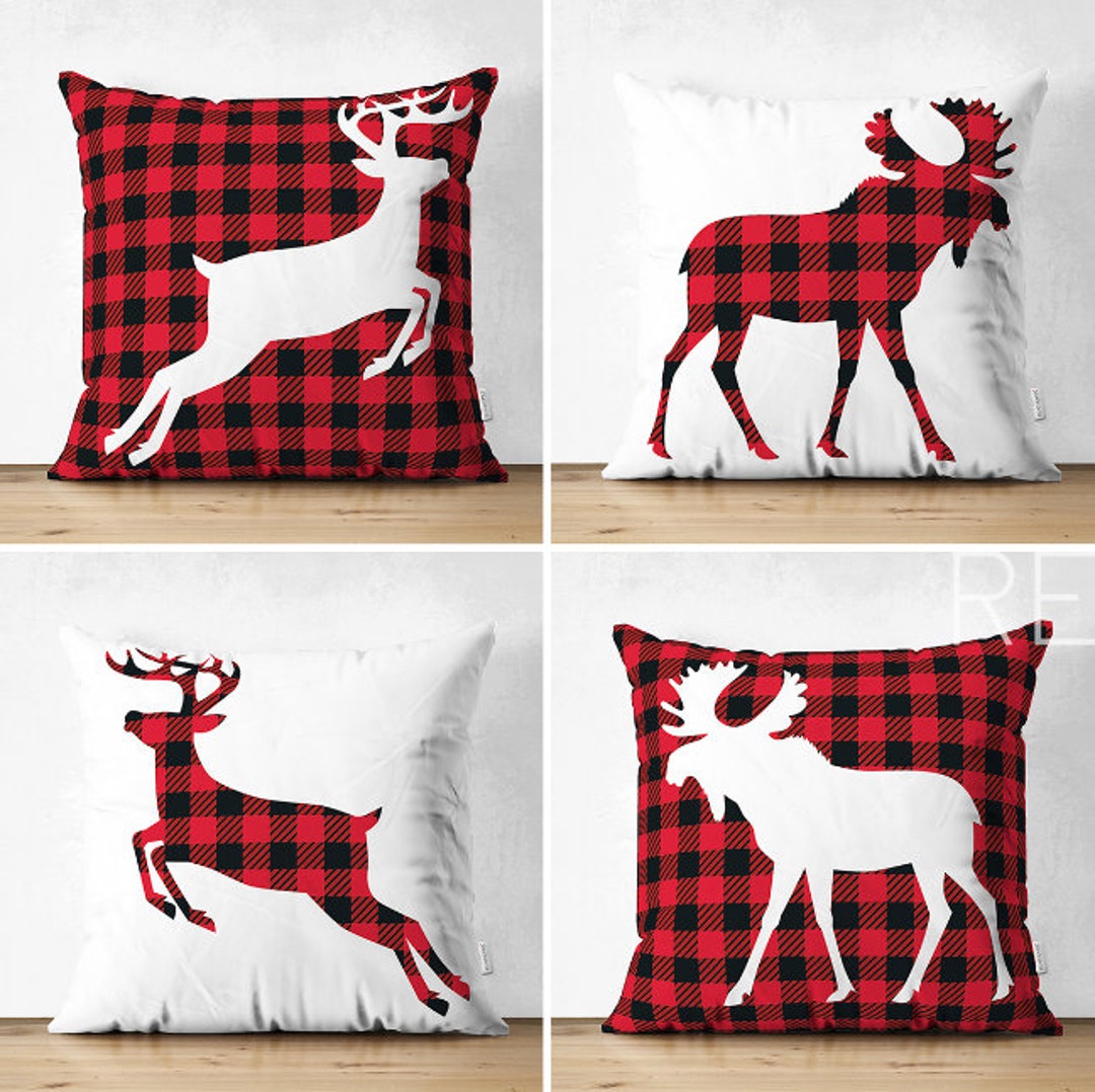 Set Of 4 Christmas Pillow Coversbuffalo Check Christmas Deer Etsy Israel